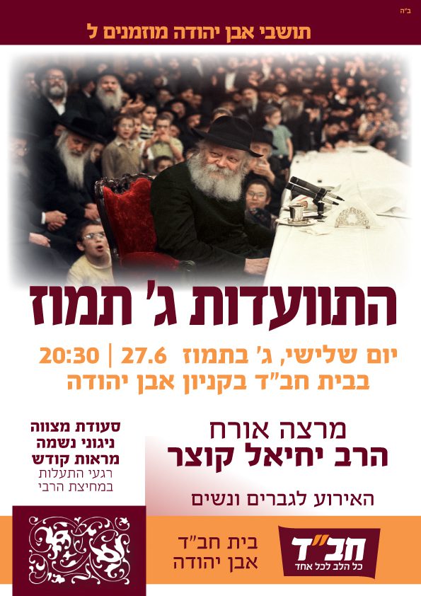 בית חב"ד באבן יהודה מזמין את הציבור הרחב להתוועדות מיוחדת עם הרב יחיאל קוצר.