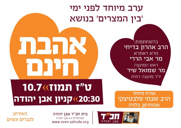 ערב מיוחד בנושא אהבת חינם יתקיים בהשתתפות מר אבי הררי והרב אהרון בדיחי • עם אורח מיוחד הרב שבתי סלבטיצקי מבלגיה • יום שני, 10.7 בשעה 20:30 בבית חב"ד בקניון